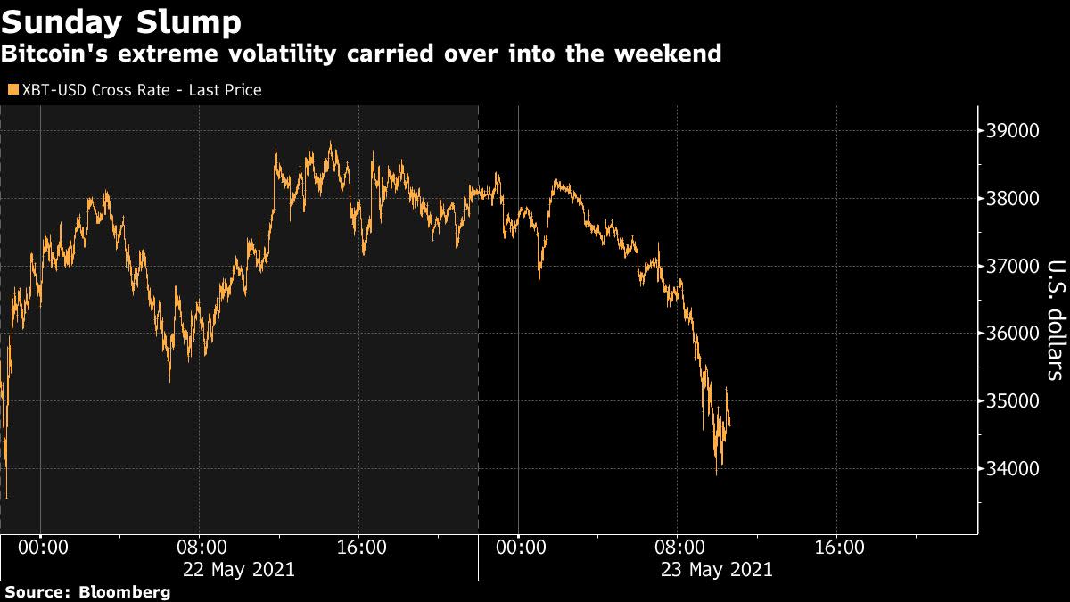 Bitcoin traded at $33,052, down 13%, as of 3:45 p.m. in New York, holding below its 200-day moving average; other cryptocurrencies, including Ethereum and Dogecoin, also slumped, according to CoinGecko.com. Earlier in the weekend, Bitcoin had climbed more than 8% to move back above $38,000 following a tweet from Elon Musk.